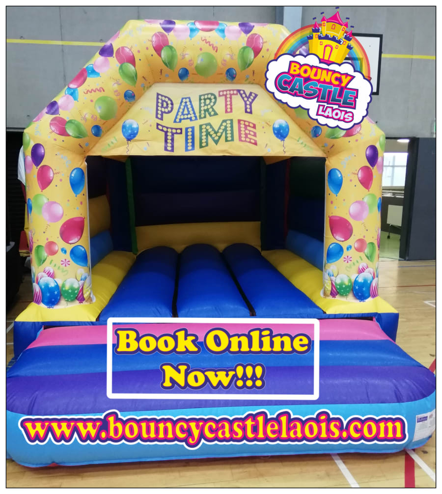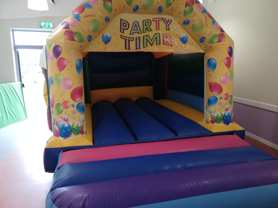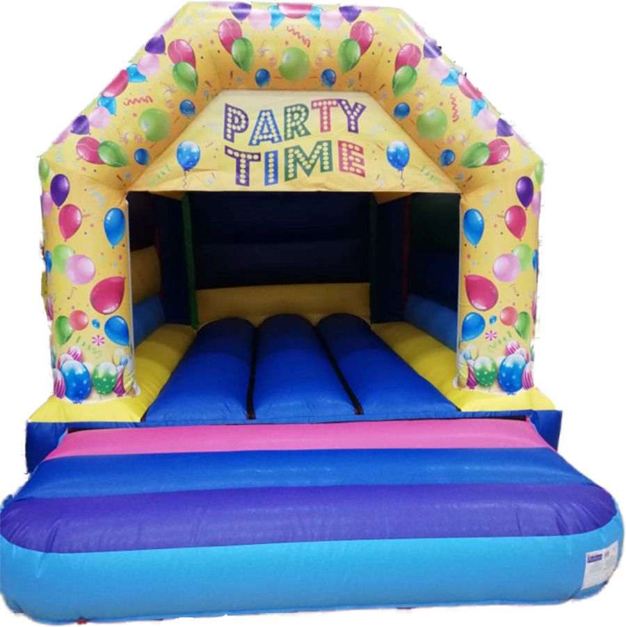 This small, blue Party Time Castle is perfect for birthday parties, backyard gatherings, and other celebrations. It's easy to set up - just plug it in and inflate! The bouncy castle is a great way to keep kids entertained and happy.